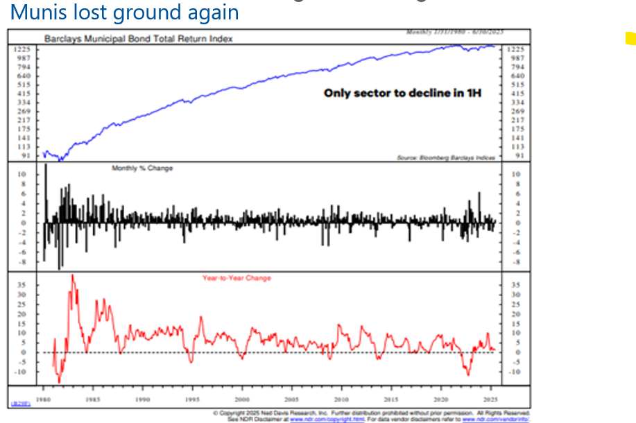 In Q2, bonds delivered moderate gains, with the U.S. Aggregate rising 1.2%, less than half of Q1’s performance. Returns varied by maturity, with 3 to 7-year bonds gaining 1.8%, while long-term maturities slipped slightly. Credit markets rebounded, led by high yield up 3.5%, emerging market debt up 2.5%, and leveraged loans up 2.3%. Munis declined again, weighed down by their longer duration, making them the only sector with negative returns in the first half (chart below).