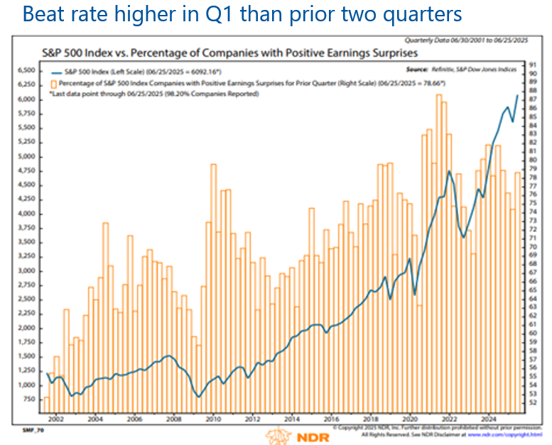 With headlines dominated by Middle East tensions, Fed policy, and market volatility, Q1 earnings largely flew under the radar. Now that the dust is settling, a closer look shows solid performance. With 98% of S&P 500 companies reporting, the beat rate reached 79% (chart below). This was better than the past two quarters, though only the fourth highest in the last eight.