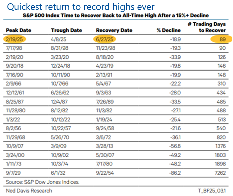 The second quarter of 2025 delivered one of the most dramatic market reversals in recent history. Following President Trump’s Liberation Day tariff announcement, the S&P 500 fell 10% over two trading days, marking just the fourth such drop since World War II. Despite the steep fall, the rebound was even more historic. The index’s 12.1% slide from April 2 to April 8 was the largest intra-quarter correction to be completely erased within the same quarter since at least 1928. From its February highs, the S&P 500 recorded the fastest recovery from a correction of at least 15% (table below).
