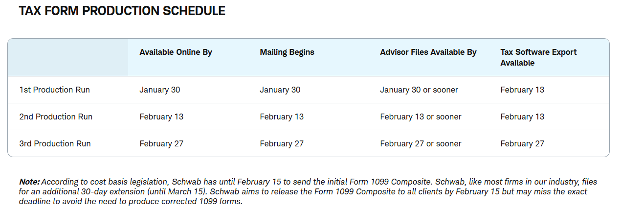 Clients that have enrolled to receive their 1099s online will receive an e-mail notification from Charles Schwab once your 1099 is available for download. For clients receiving paper documents, please allow 5-7 days for mail delivery.